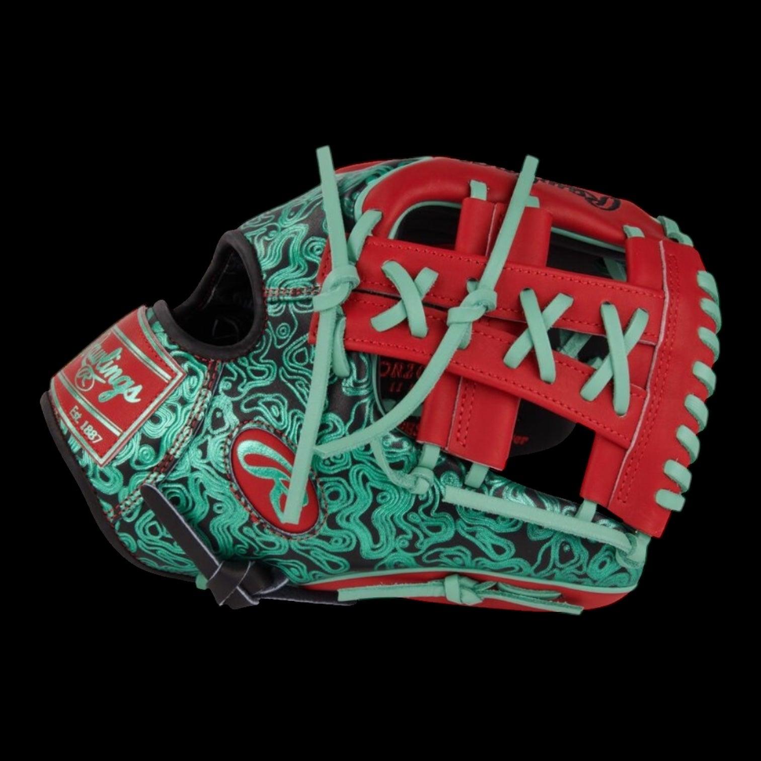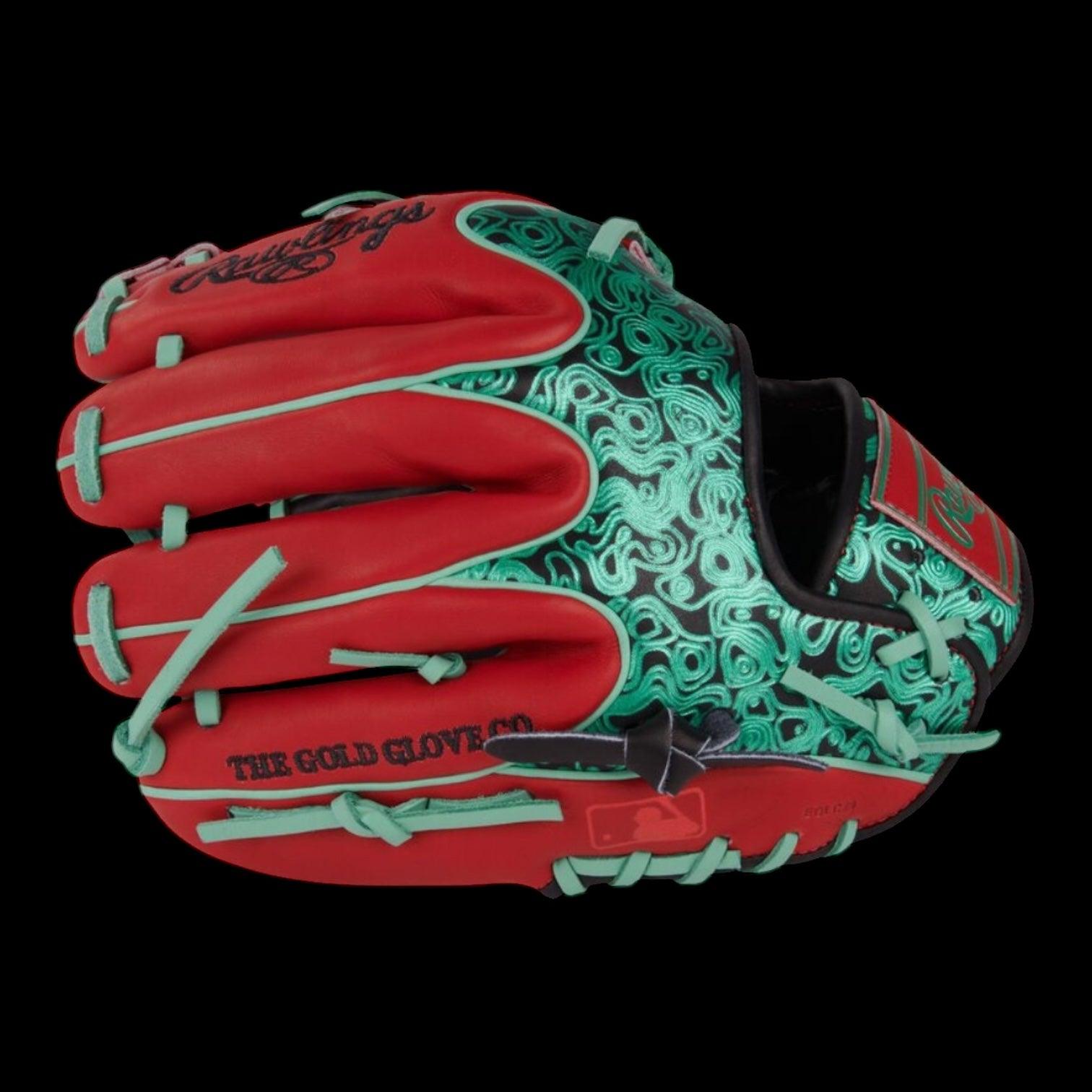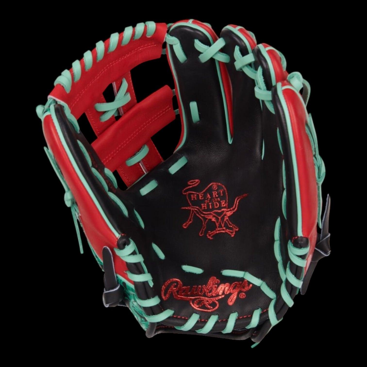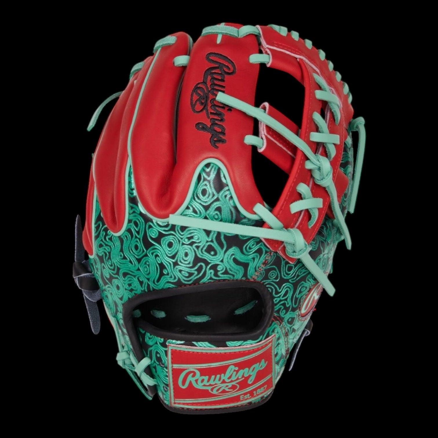 This 11.5-inch Rawlings Heart of the Hide Colorsync infield glove is a must-have for elite infielders and glove collectors alike. Right off the bat you will notice this gloves stunning mint geoprint pattern on top of its black leather. Additionally, this glove includes many red accents that pairs well with its red leather trim. To top it off, we slapped on a unique leather, red and mint Rawlings patch that will have you glowing on the field.